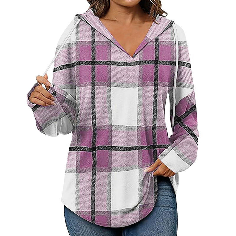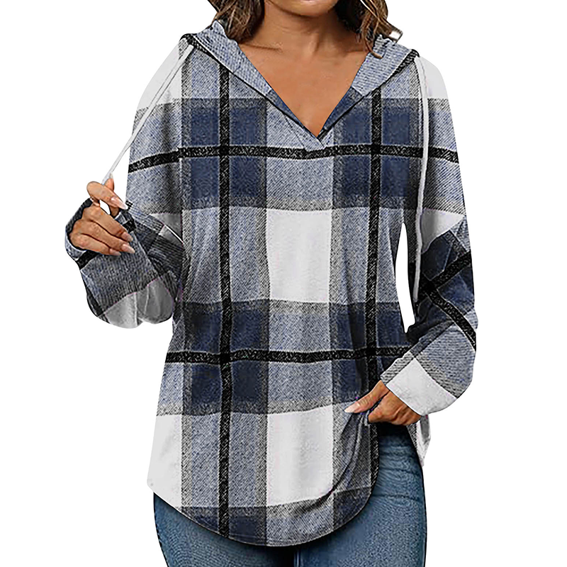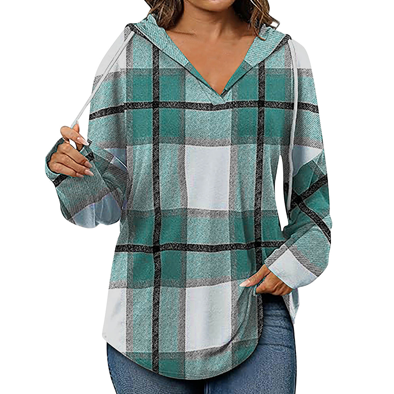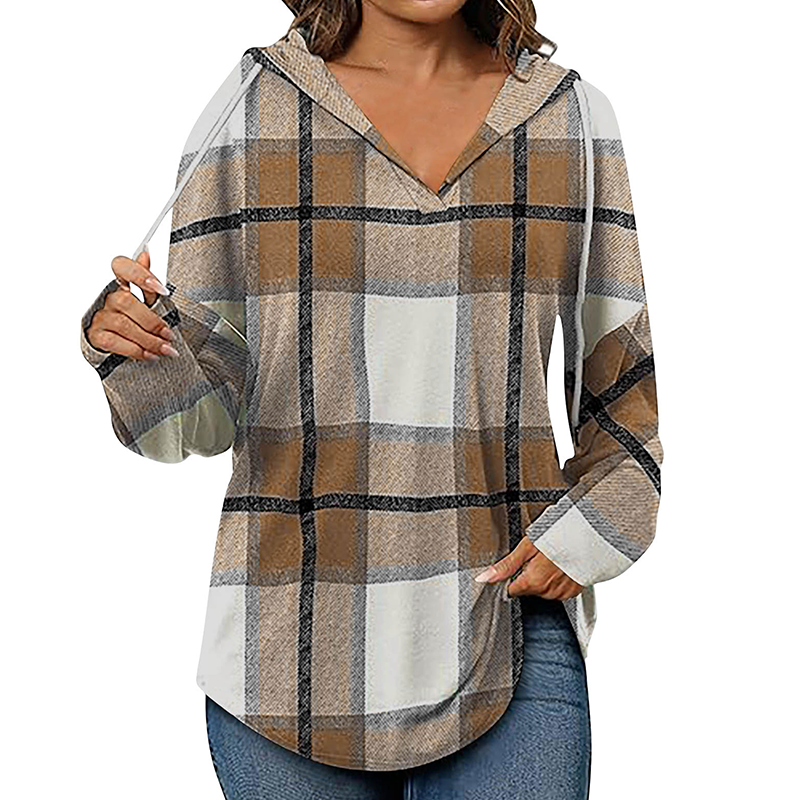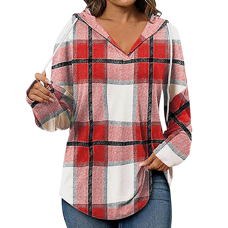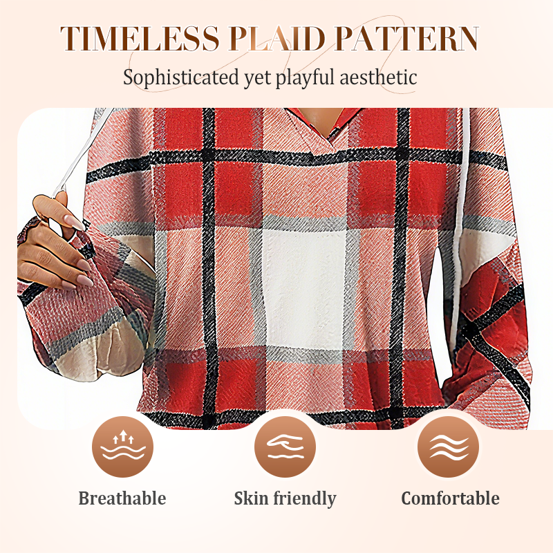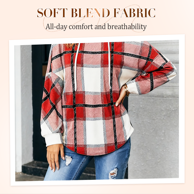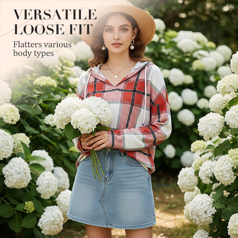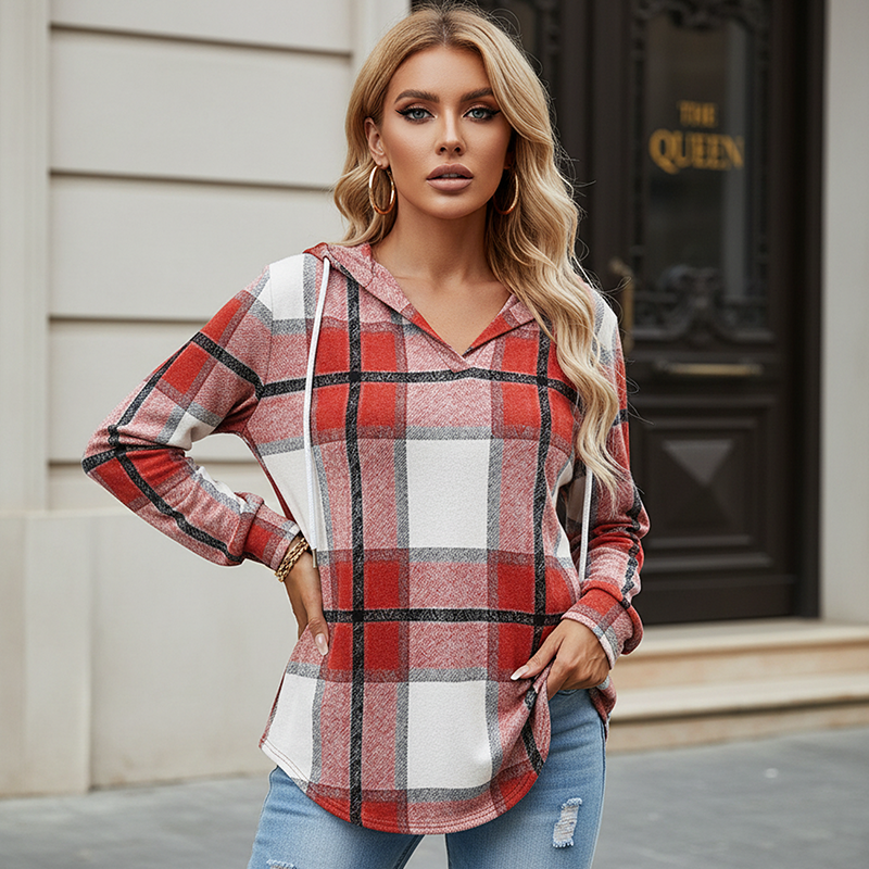 Zawartość opakowania: 1 damska koszulka w kratę z kapturem, długim rękawem, sznurkiem i dekoltem w serek.