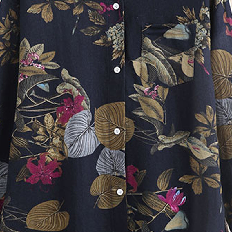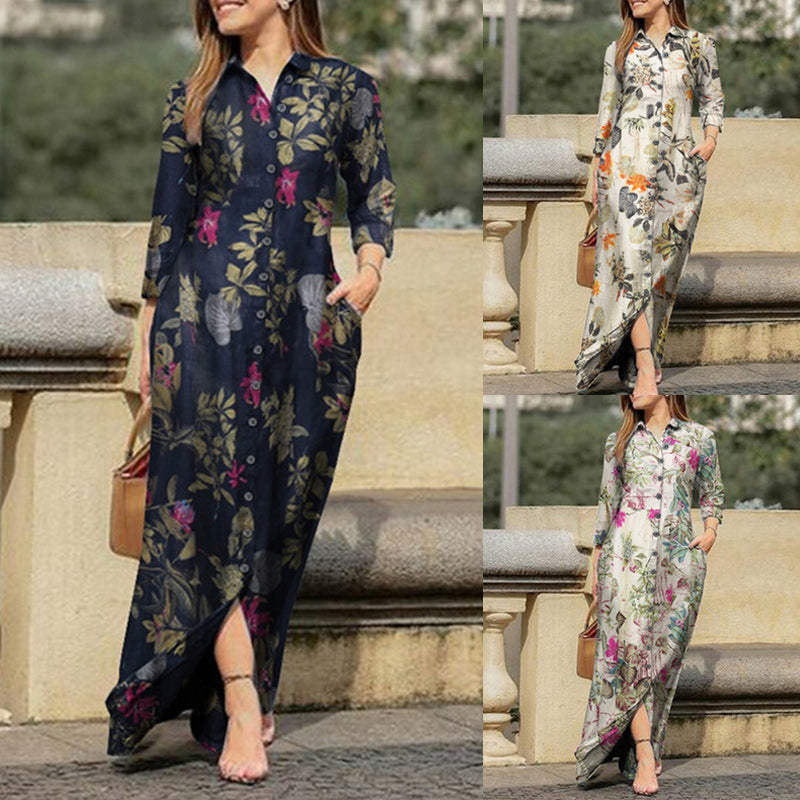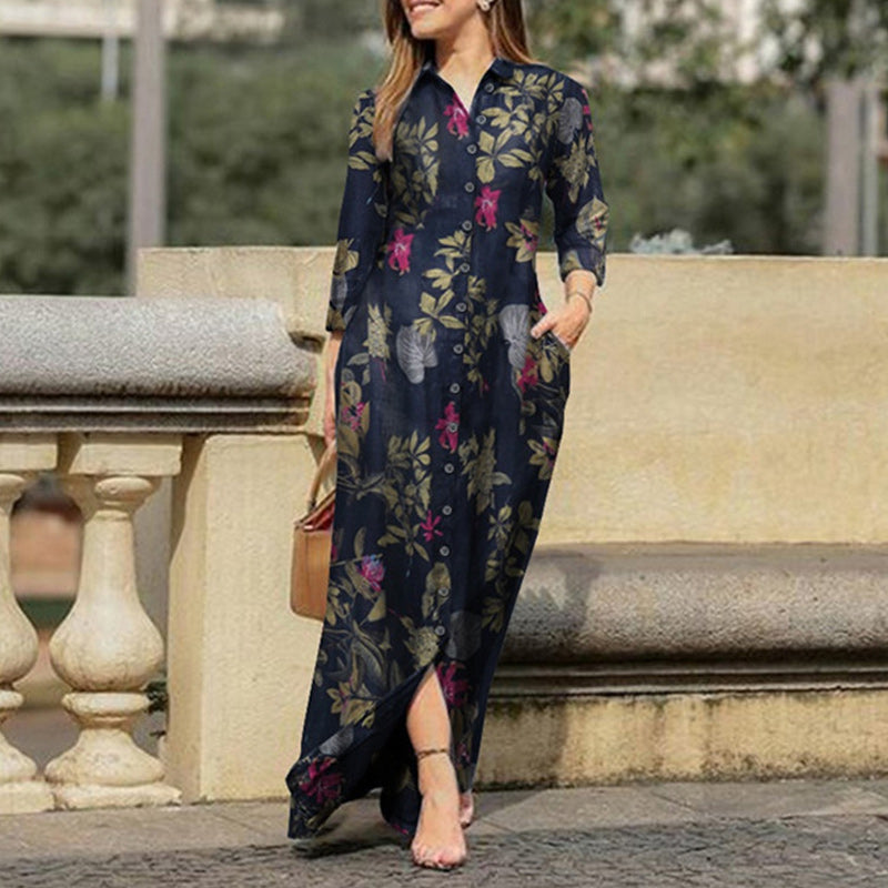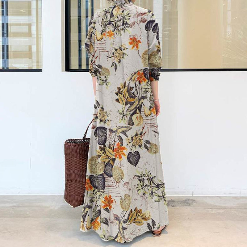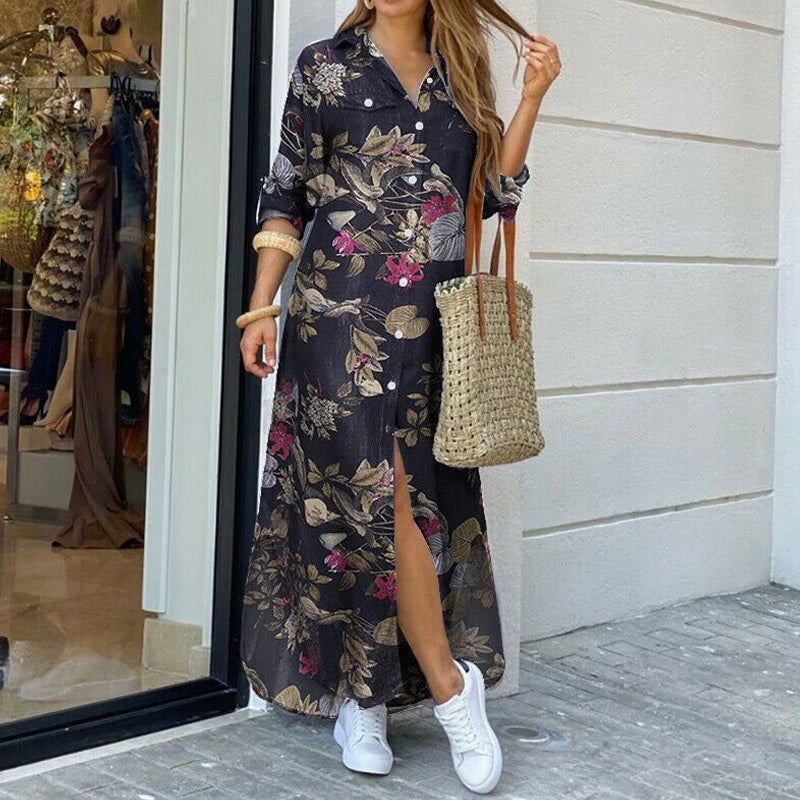 1* Damska sukienka wakacyjna z kołnierzykiem, długimi rękawami i kwiatowym nadrukiem