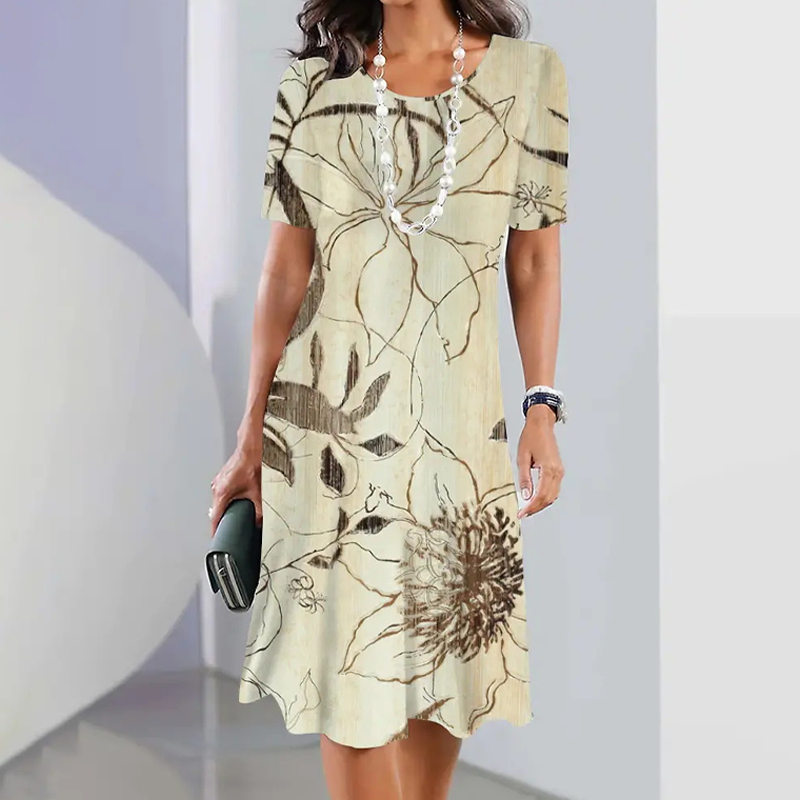 👗 ELEGANCKI WZÓR – Damska sukienka midi z okrągłym dekoltem wyróżnia się subtelnym, przyciągającym wzrok kwiatowym nadrukiem, który dodaje klasy i kobiecego uroku. Prosty dekolt idealnie współgra z całością, tworząc stylowy i swobodny wygląd.