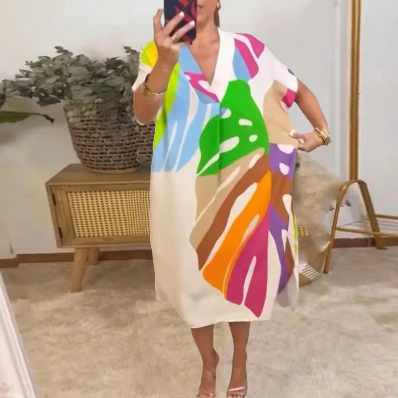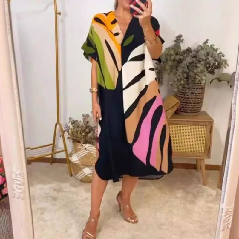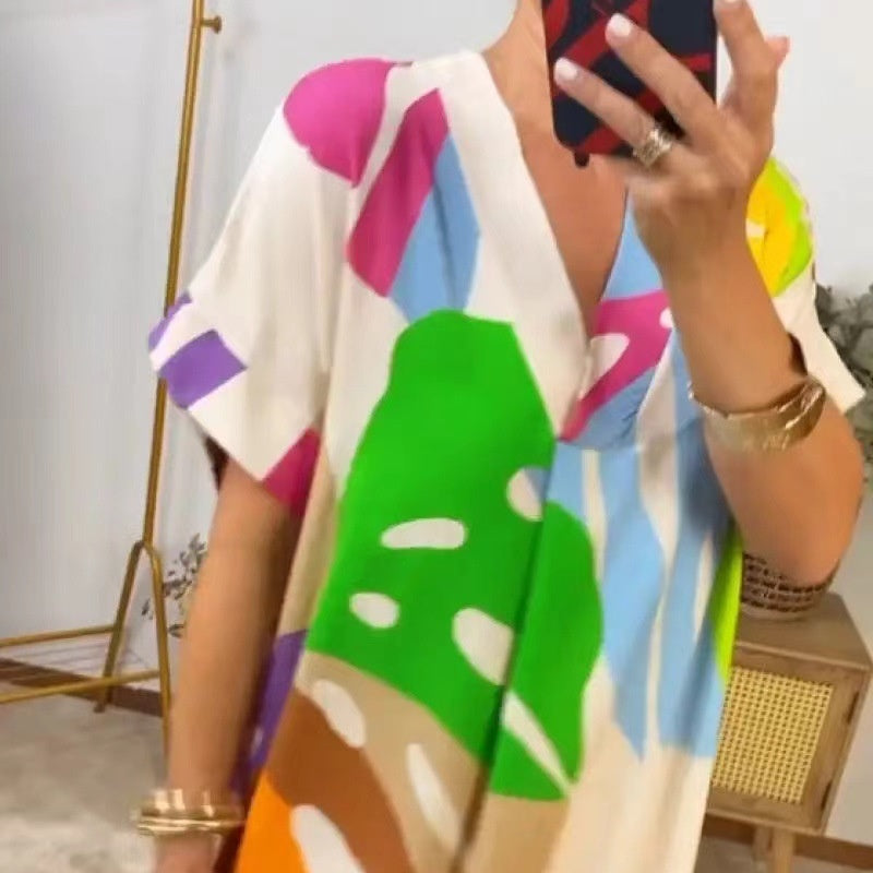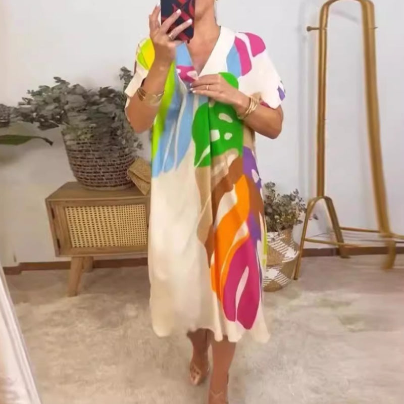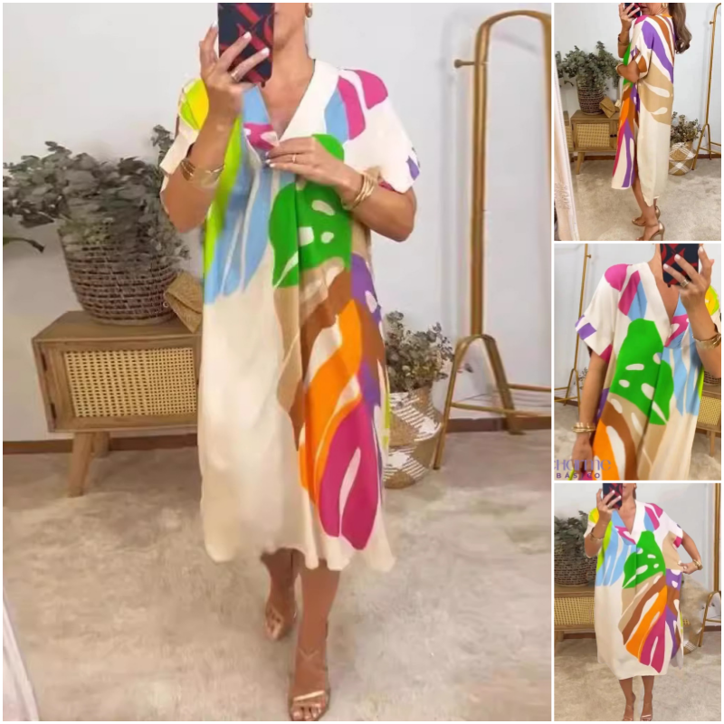 Pakiet zawiera 1 * Damska sukienka z krótkim rękawem z dekoltem w szpic z nadrukiem.