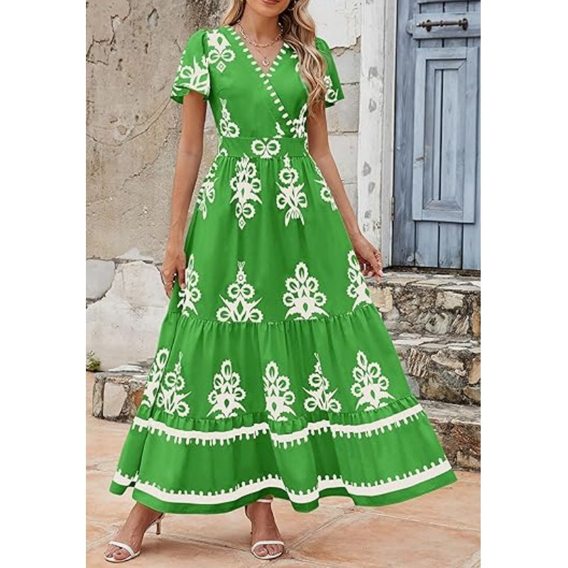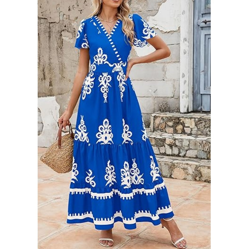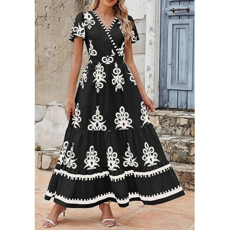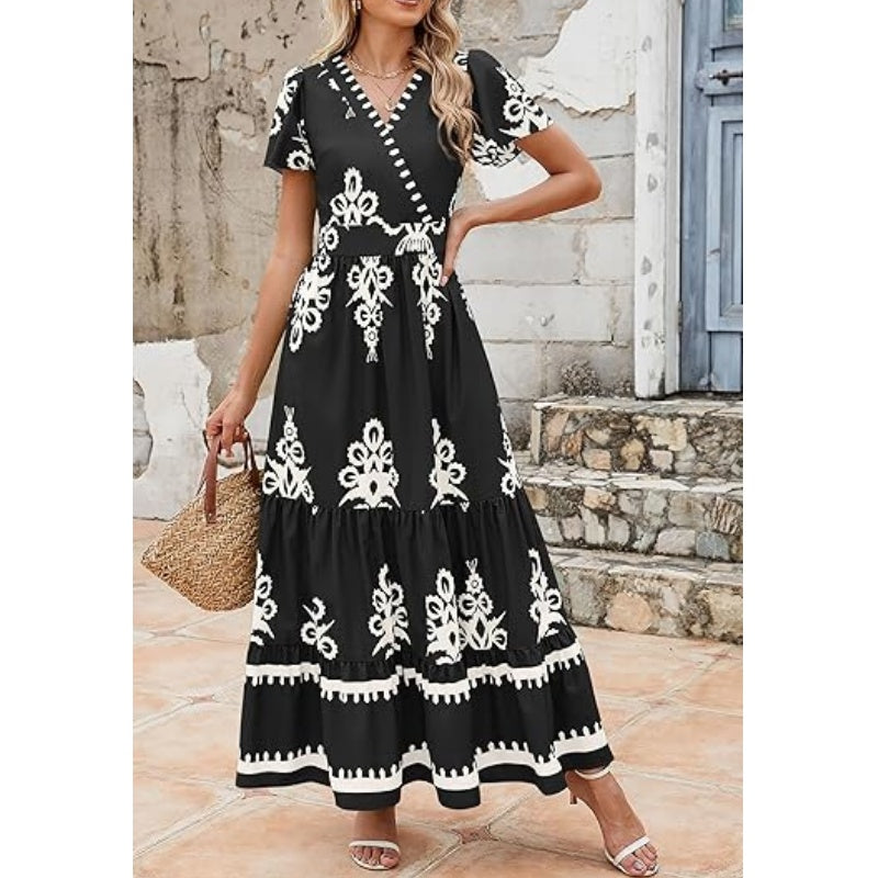 WSZECHSTRONNY STYL: Ta wyjątkowo długa sukienka w stylu bohemy ma elegancki nadruk i pochlebny dekolt w kształcie litery V, idealny na każdą okazję. Noś ją z sandałami, aby uzyskać swobodny wygląd, lub ze szpilkami, aby spędzić noc w mieście - to sukienka, która zapewni Ci styl bez wysiłku.